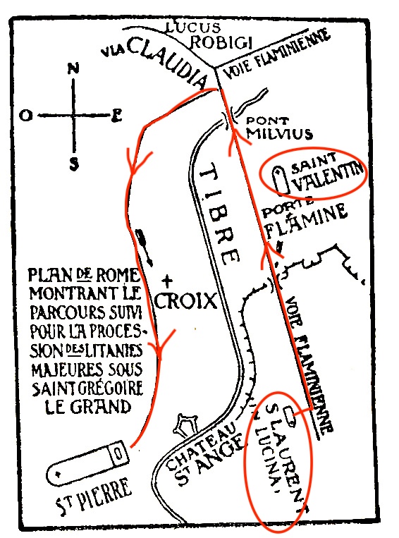 L’Église célèbre aujourd’hui deux solennités qui n’ont pas de rapport entre elles : Les Litanies Majeures et la Fête de saint Mars, instituée postérieurement. ![]() 1155 À Rome, il y avait autrefois le 25 avril la solennité païenne des Robigalia. Elle consistait principalement en une procession qui sortait de la ville par la porte Flaminienne, se dirigeait vers le Pont Milvius et se terminait dans un sanctuaire suburbain situé sur la voie Claudia et où l’on immolait une brebis en l’honneur d’un dieu ou d’une déesse Robigo (dieu ou déesse de la gelée). La litanie majeure fut la substitution d’une cérémonie chrétienne à cette cérémonie païenne. Le parcours nous en est connu par une convocation de saint Grégoire le Grand. Il est sensiblement le même que celui de la procession païenne. Tous les fidèles de Rome se rendaient à l’église S. Laurent in Lucina, la plus voisine de la porte Flaminienne. La procession sortait par cette même porte, faisait station à saint Valentin, traversait le pont Milvius, puis obliquait à gauche vers le Vatican. Après s’être arretée à une croix, elle se rendait dans la basilique S. Pierre pour la célébration des Saints Mystères. Cette litanie se récite dans toute l’Église pour écarter les fléaux, et attirer la bénédiction de Dieu sur les moissons. « Daignez donner et conserver les fruits de la terre, nous Vous en prions, écoutez-nous », chante l’Église en traversant processionnellement les campagnes. La messe tout entière montre ce que peut obtenir la prière assidue, lorsqu’au milieu de nos adversités (Oraisons, Off.) nous recourons à notre Père du Ciel avec confiance (Ép., Év., Com.). |